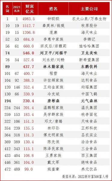 農(nóng)夫山泉鐘睒睒以4983.5億元財富成功連任首富,牧原股份的秦英林和錢瑛夫婦首度進入榜單前十。