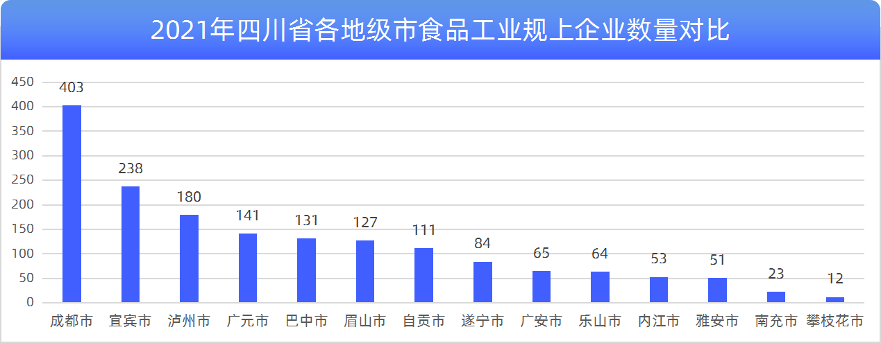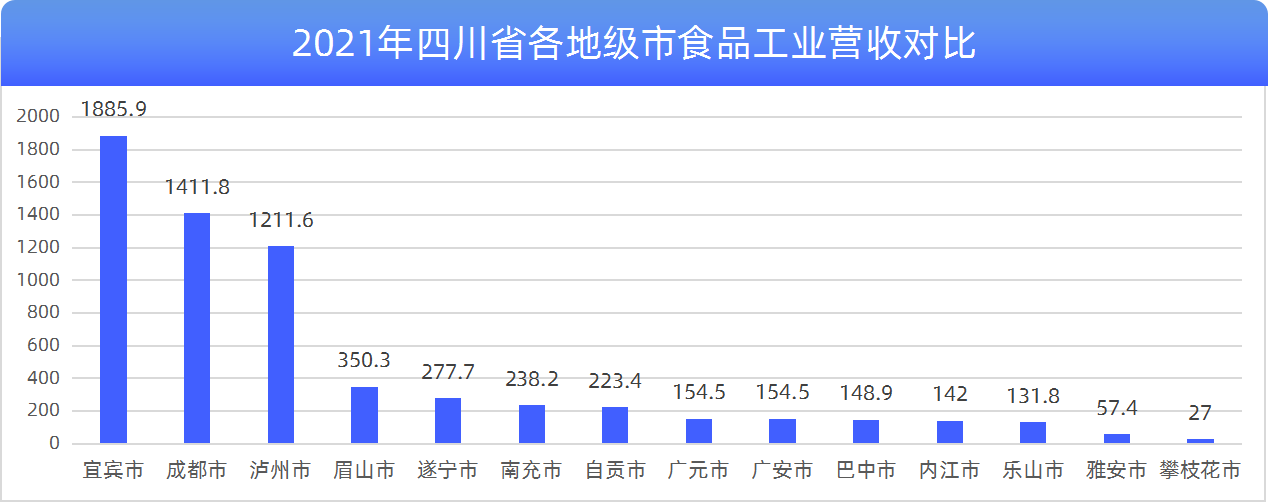 2021年,四川省食品工業地級市規上企業數量排名前三的市域依次是成都市、宜賓市、瀘州市。其中成都市主要以農副食品加工業為主,占比約49.4%。宜賓市主要以農副食品加工業為主,占比約47.1%。瀘州市主要以酒、飲料與精制茶制造業為主,占比約74.4%。 (數據來源:各地級市2022統計局年鑒。德陽市、資陽市、達州市統計局沒有公開發布,本次對比沒有列入。單位:個) 2021年,四川省食品工業營業收入排名的前三的市域依次為宜賓市、成都市、瀘州市。其中宜賓市與瀘州市均以酒、飲料與精制茶制造收入為主,占比分別為91.3%、91.7%。成都市食品工業營收主要以農副食品加工以及煙草制品為主,兩項指標總共占比達60.5。省內地級市之間營收兩極分化,宜賓市、成都市與瀘州市三市營收超過4509.3億元,占全省食品工業營收48.3%。 (數據來源:各地級市2022統計局年鑒。德陽市、資陽市、達州市統計局沒有公開發布,本次對比沒有列入。單位:億元) 2021年,四川省食品工業利潤總額排名前三的市域依次為宜賓市、瀘州市、成都市。其中酒、飲料與精制茶利潤貢獻占宜賓市、瀘州市分別為96.7%、97.5%。根據柱狀圖對比可見,遂寧市、眉山市等11個地級市利潤總額不滿50億。 (數據來源:各地級市2022統計局年鑒。德陽市、資陽市、達州市統計局沒有公開發布,本次對比沒有列入。單位:億元) 通過四川省農食產品產量對比分析,2020年四川白酒產量367.6萬噸,居全國第一位。軟飲料產量2002.2萬噸,產業規模位居全國前列。農業生產中,蔬菜及食用菌生產量為4813.4萬噸,遙遙領先其他門類。林業生產中,核桃產量60.6萬噸。牧業生產中,肉類產量597.9萬噸。漁業生產中,水產品產量160.4萬噸。 (數據來源:2021年四川省統計年鑒 制表:食業園區研究院)
