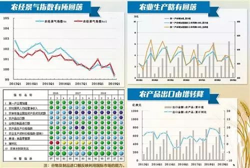 中經農業經濟景氣監測預警結果顯示,2019年一季度,中經農業經濟景氣指數為99.4,比2018年四季度回落1.1點,比上年同期低1.6點。中經農業經濟預警指數為80.0,比2018年四季度低6.7點,由“綠燈區”回落至“淺藍燈區”。一季度,農業生產略有回落,農業生產結構持續優化;財政支農力度持續加大;糧油食品零售平穩增長。但在鄉村振興戰略框架下,農業投資增速明顯回落不利于農業持續健康發展,應予以關注。
