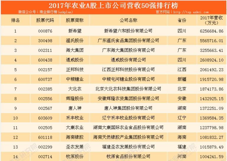根據中商產業研究院大數據庫顯示:2017年農業行業營收排名前十企業依次為新希望、溫氏股份、海大集團、通威股份、正邦科技、中糧糖業、大北農、輝隆股份、唐人神以及禾豐牧業。其中,2017年農業A股上市企業50強中,營收超百億的企業有14家,60%以上的上市企業應收未過百億。