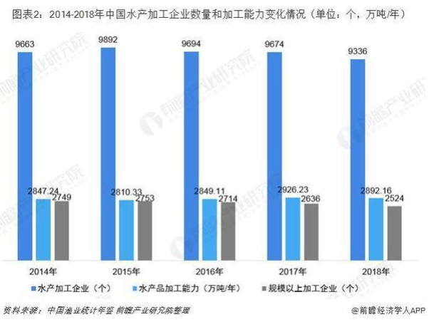 新一輪金融危機后,在復雜的經濟形勢下,大規模水產品加工企業沒有增加,效益低下、開工率不足問題突出,一批競爭力弱的企業漸被淘汰。據農業部漁業漁政管理局發布的《中國漁業統計年鑒》數據,2014-2018年,中國水產加工企業數量及其水產品加工能力整體呈現下降態勢。2018年中國水產品加工企業數量由2017年的9674個下降至2018年的9336個,水產品加工企業水產品加工能力由2017年的2926.23萬噸/年下降至2018年的2892.16萬噸/年,規模以上加工企業由2017年的2636個下降至2018年的2524個。在國家調控之下,行業進入了調整階段,更加注重發展質量。