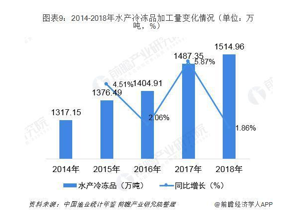 2014-2018年,我國水產冷凍品數量呈穩定增長態勢,但受行業發展以及經濟結構調整的影響,增長速度有所下降。2018年,我國水產品冷凍加工行業實現產量1514.96萬噸,同比增長1.86%。