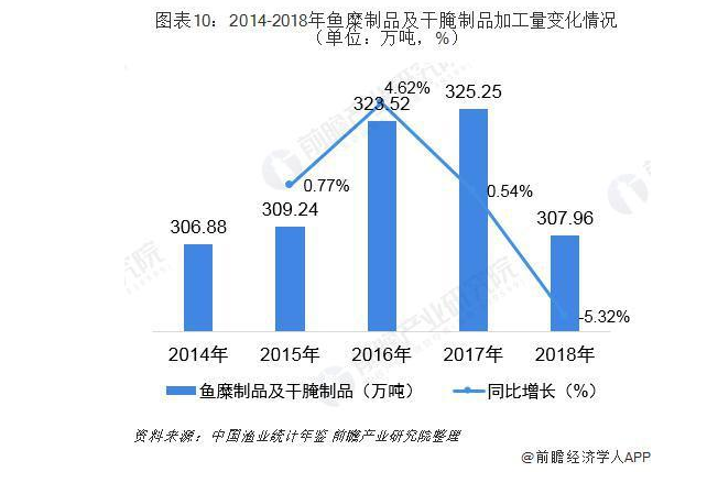 從產量的角度來看,2014-2017年,我國魚糜制品及水產品干腌制加工行業生產規模保持穩定增長。2018年,我國魚糜制品及水產品干腌制加工行業加工量為307.96萬噸,同比下降5.32%。