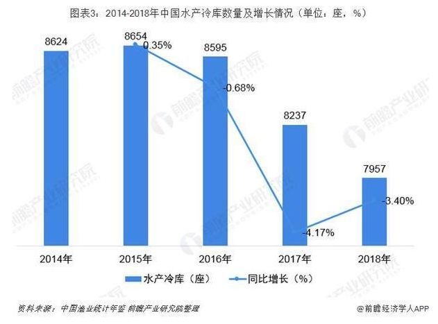 近年來,由于競爭力弱的水產企業漸被淘汰,中國水產冷庫數量也隨之下降,2918年中國水產冷庫數量為7957座,同比下降3.4%。中國在水產冷藏技術方面有了較大進步,凍結能力和冷藏能力得到了很大提高,加工原料及加工產品的質量得到了充分保障。目前,水產冷庫在國內市場由最初的高速發展進入到穩定發展時期,但冷庫的實際凍結能力、冷藏能力、制冰能力都保持在較強狀態。