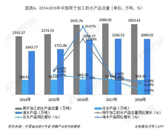 從用于加工的水產品總量來看,隨著上游水產品生產量增速的放緩,2014-2017年,用于加工的水產品總量呈波動上升態勢,但2016年后增速開始下降。2018年產量小幅下降,同比減少0.99%,為2653.41萬噸。分產品類別看,用于加工的淡水產品和海水產品數量分別下降,2018年分別為554.39萬噸、2099.02萬噸。