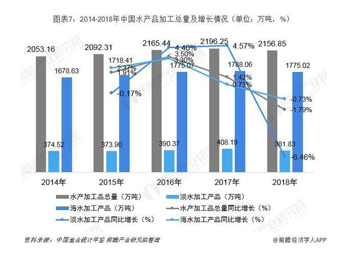 水產加工品按水產品分類方法,可分為淡水加工產品和海水加工產品。從水產加工品總量來看,2014-2017年,中國水產品加工總量呈增長趨勢。2018年,中國水產品加工總量較2017年同比下降1.79%,為2156.85萬噸。分產品來看,2018年淡水加工產品和海水加工產品均較2017年下降,分別為381.83萬噸和1775.02萬噸。