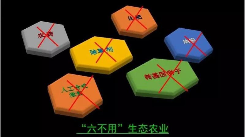 狹義的弘毅“六不用”生態農業模式,即不使用農藥、化肥、除草劑、地膜、人工合成激素與轉基因種子六大類常規農業投入物,廣義的“六不用”生態農業模式,除上述六大類化學物質外,在加工過程中也杜絕非天然的人造化學物質。人類圍繞食物鏈,從飼料生產到食物加工,所發明的化學物質高達幾萬種。