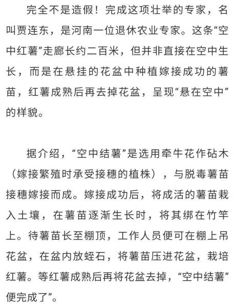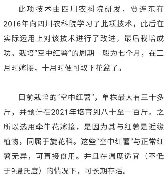 據(jù)中國科學院植物學博士史軍介紹,目前培育“空中紅薯”的目的主要作為景觀,此外,在未來土地資源有限的情況下,垂直空間的利用還可提高空間利用率。史軍說,此類技術目前并未普及,可作為未來栽培技術的儲備。