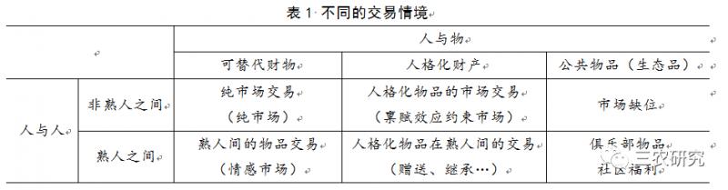 市場交易可以細分為不同的情境(表1)。主流經濟學理論關于市場性質的研究往往是在“純市場交易”情境中展開的。新古典經濟學的“純市場交易”有兩個重要前提性假設,一是產品或服務的同質性,二是產品或服務的可分性。同質性意味著可替代性,因此市場出清要么只是供求數量上的均衡,要么是不同產品之間的價格均衡。可分性意味著不僅不用考慮公共物品問題,而且無論是生產者或者消費者均可在不損失效率的情況下擴大或縮小生產規模或購買數量,從而確保資源的有效配置與市場出清。然而,現實生活中普遍存在的是產品或服務的非同質性與非完全可替代性。Radin將財產分為人格化財產和可替代財物。這意味著,對于產權主體來說,對不同產權客體的價值評價是不一樣的,人格化財產相比于可替代財物,具有更為強烈的稟賦效應。從而,稟賦效應必將破壞完全競爭市場中的供求均衡及其市場出清。不過,稟賦效應理論重點聚焦的是交易過程中“人-物”關系,沒有注意到不同交易主體之間(“人-人”)存在的情景差異,因為有些交易包含著情感性交易。同樣,外部性與公共物品問題不僅普遍存在,由于缺乏有效的價格發現機制,往往會導致外部經濟性或“好”的公共物品供給不足,而外部不經濟或“壞”的公共物品供給過剩。盡管科斯定理部分關注了生態品(公共物品)的產權界定問題,但離解決其價格發現及其可交易機制,還有很大的距離。