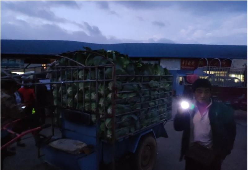 近產(chǎn)地的批發(fā)市場,農(nóng)民的蔬菜等待這個集貨者出價,他在拿手電看蔬菜品相,時間為;凌晨3點。