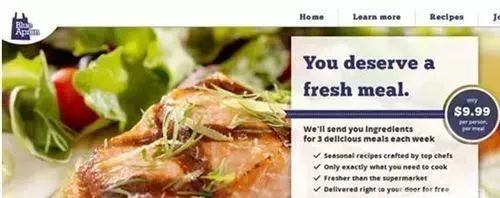 與hellofresh形成競爭關系的是2012年成立的Blue Apron公司,其目前將融資1億美元,市面估值20億美金。那么兩個公司的基本模式都是相似的,那么差異化體現在哪里呢?最大的區別在于hellofresh是與超市及快餐店合作的形式采購原材料,而Blue Apron則是自己售賣食材,而具體的訂閱形式,兩個公司也是不同的。Blue Apron的商業模式為向訂閱用戶遞送提前按量配好的“美食配菜包”,里面包括食材、調味品和配套的食譜。訂閱費用每周60 美元,平均每餐10 美元,主要用戶的訂閱套餐為每周3 頓兩人餐。Blue Apron 的菜單包含六種菜譜,并且每周更換。如果訂閱用戶覺得這周的菜譜不給力,可以將本周的量挪到以后使用。
