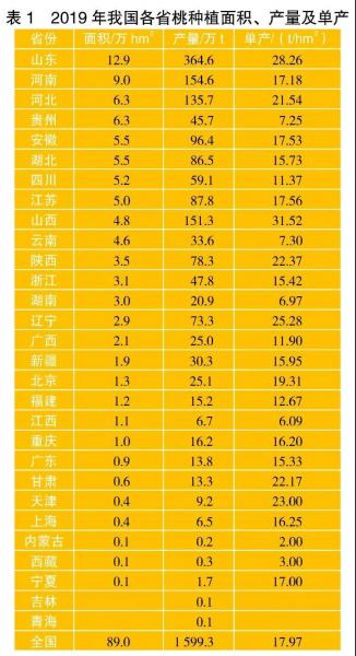 我國有20個省的桃種植面積超過1萬hm2(15萬畝),位居前5位的省份依次為山東、河南、河北、貴州和安徽,總產量位居前5位的省份依次為山東、河南、山西、河北、安徽;而單產水平位居前5位的省份依次為山西、山東、遼寧、天津、陜西(表1),呈現出北方顯著高于南方的趨勢。(注:hm2即平方百米=1公頃=15畝)