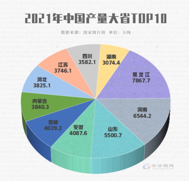 全國產(chǎn)量排名前三的省份是黑龍江、河南、山東,糧食總產(chǎn)量占全國的30%左右,安徽、吉林、河北、江蘇、內(nèi)蒙古、四川和湖南七省位列糧食產(chǎn)量前十。