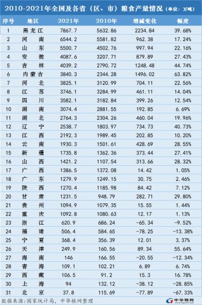 黑龍江、河南、山東、吉林、內(nèi)蒙古、河北、遼寧七省,2021 年糧食總產(chǎn)量達到34155.9萬噸,占全國糧食產(chǎn)量的一半以上,但七省人口僅占全國人口的三分之一不到。