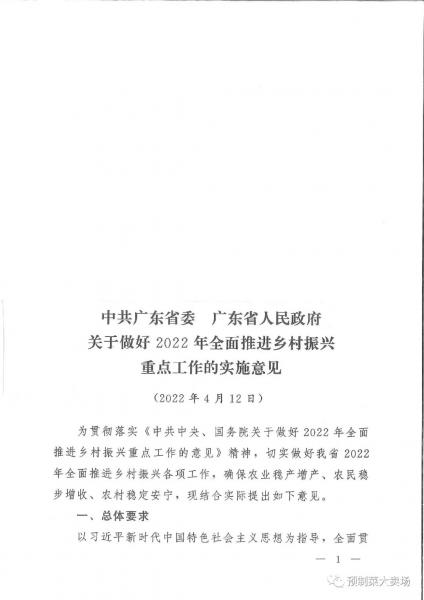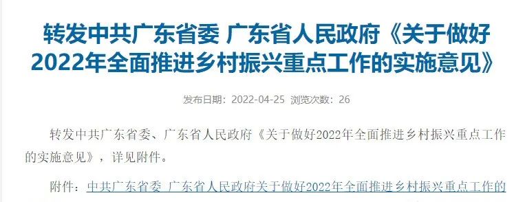 為貫徹落實《中共中央、國務院關于做好2022年全面推進鄉村振興重點工作的意見》精神,切實做好廣東省2022年全面推進鄉村振興各項工作,確保農業穩產增產、農民穩步增收、農村穩定安寧,近日,中共廣東省委 廣東省人民政府《關于做好2022年全面推進鄉村振興重點工作的實施意見》(以下簡稱《實施意見》發布。