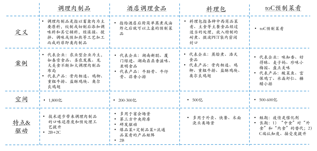 預(yù)制菜一直以來定義較模糊,囊括了多個品類和場景。我們觀察到目前業(yè)內(nèi)大部分研報主要針對速凍火鍋制品、速凍肉制品為主。