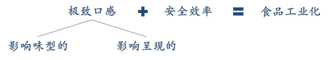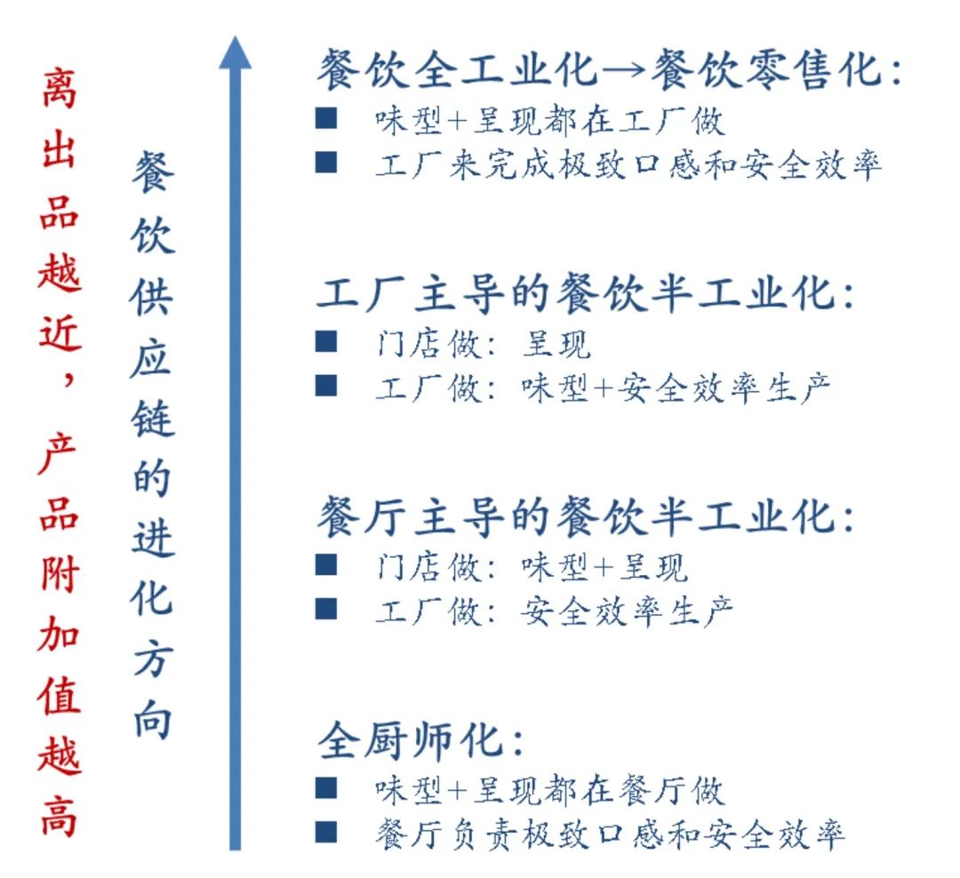 再往上是工廠主導(dǎo)的餐飲半工業(yè)化,即門店做呈現(xiàn),工廠做味型+安全效率生產(chǎn),預(yù)制菜和各類復(fù)合調(diào)味料都屬于該范疇,門店端只需要簡單復(fù)熱加裝盤即可。這類模型對工廠極致口感打造的能力要求較高,目前還處于導(dǎo)入期。