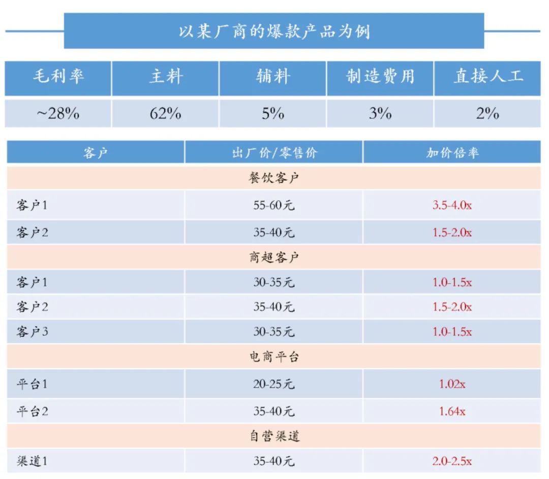 以下面圖示這家我們盡調(diào)過的企業(yè)為例,這家有個爆款產(chǎn)品,最早是供應(yīng)給一家中高端的餐飲品牌,產(chǎn)品經(jīng)過不斷打磨,成為了一款爆款。基于此,公司針對該產(chǎn)品按照不同渠道進行了定制化改良,在冷凍/冷藏、規(guī)格、口味、配菜等等維度上都做了微調(diào)。數(shù)據(jù)顯示,整體是個從高打低的過程,在高端餐飲渠道能賣到3.5-4倍的加價率,在線下商超和到家平臺賣到1-2倍加價率,以走量為主,在線上自己旗艦店賣到2-2.5倍加價率。整體上,我們看到其在餐飲品牌的合作為其他渠道的零售鋪墊了較好的品牌產(chǎn)品勢能。簡單來說,比如同樣一款酸菜魚,在餐飲門店作為一款招牌菜賣200元,在超市賣50元,主打某某品牌招牌菜同款,消費者還是很買賬的,因此我們說餐飲客戶的招牌菜的高加價倍率可為其他渠道提供了可騰挪的利潤空間。