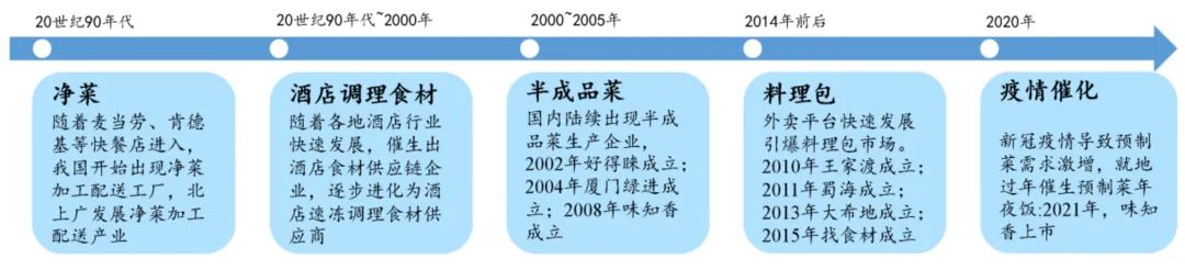 從行業(yè)歷史發(fā)展來看,其實預(yù)制菜在中國可以追溯到至少30年前。20世紀90年代,隨著麥當勞、肯德基等快餐店進入,我國出現(xiàn)了一批凈菜加工配送企業(yè),但他們大多以原料型凈菜粗加工企業(yè)為主。之后逐步經(jīng)歷了酒店調(diào)理食材、半成品菜、料理包,再到現(xiàn)在預(yù)制菜肴的過程。