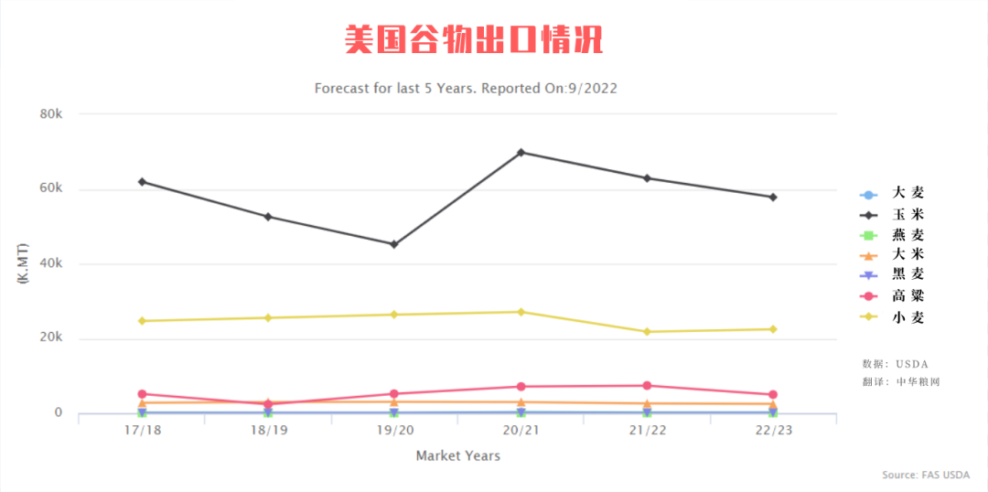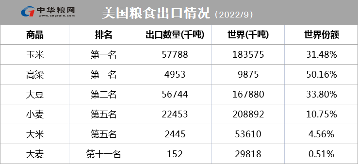 美國是全球第一大玉米生產國和出口國,玉米產量和出口量均占世界總量的三分之一左右;大豆是美國第二大出口品種,出口量占全球三分之一以上,與巴西供應全球90%的大豆;還是第一大高粱生產國,占全球總產量的17%,其出口量占世界總出口量的半壁江山,高達64%,位列全球第一;小麥是美國的第二大谷物作物,占全球產量的6%,出口量占世界總出口量比重的11%,與歐盟、俄羅斯、澳大利亞和烏克蘭占全球小麥出口總量約五分之三以上。