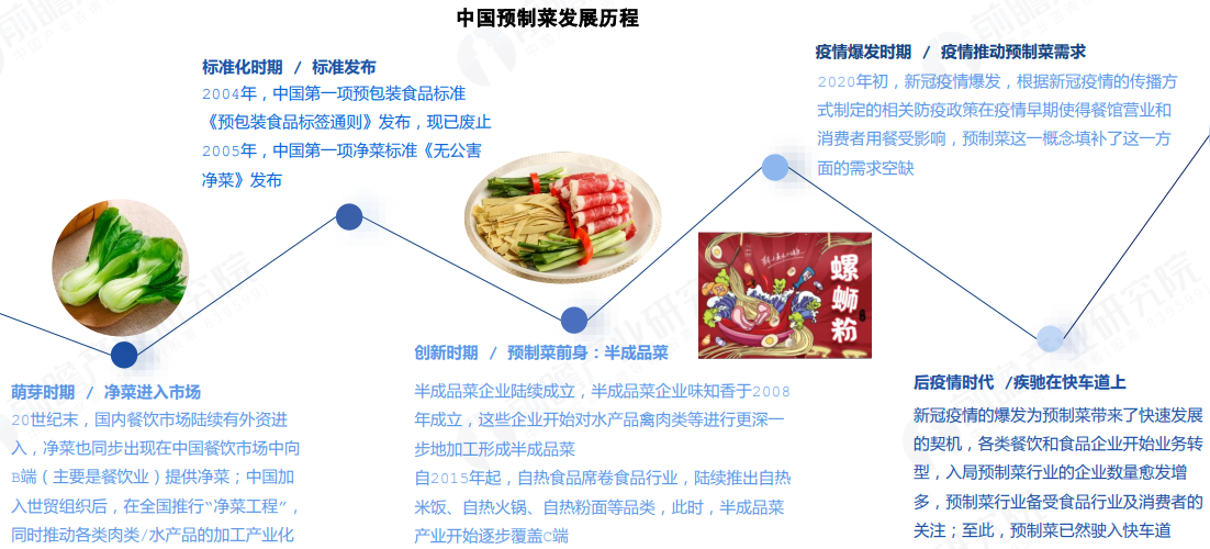 預制菜的概念本身較為復雜,其涵蓋了較多類型的食品類型,例如20世紀末開始進入中國市場的凈菜以及在2000年后開始快速發展的深加工食品。凈菜可稱為預制菜的雛形,而半成品菜為預制菜的前身,這兩樣產品進入中國市場的時間較早,表明“預制菜”這一概念出現雖晚,但事實上其具備了較長的發展基礎,為 近兩年來的快速發展奠定了穩固的基礎。