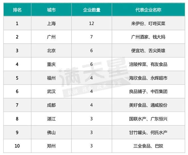 上海在榜單中的代表企業(yè)有來伊份、叮咚買菜,廣州的代表企業(yè)有廣州酒家、錢大媽,北京的代表企業(yè)有便宜坊、舌尖英雄等。