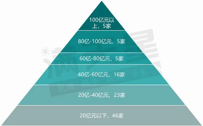 入榜企業(yè)按2022年營收規(guī)模分布來看,100億元以上的企業(yè)數量較少,為5家。