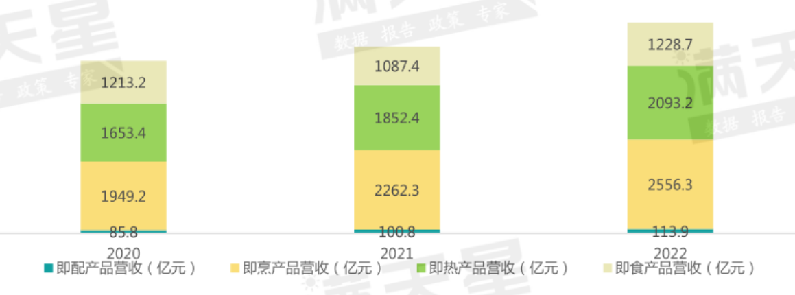2022年中國預制菜市場結構中,即烹、即熱、即食、即配類型預制菜食品規(guī)模分別為2556.3億元、2093. 2億元 、1228.7億元和113.9億元,其中,占比最高的為即烹產品,但其營收增速水平有所回落,從2022年的16.1%下降到2022年的13% 。