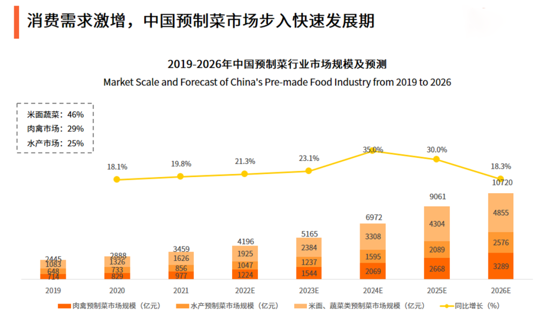 預(yù)制菜作為鄉(xiāng)村振興的重要產(chǎn)業(yè)和農(nóng)村一二三產(chǎn)業(yè)融合發(fā)展的新模式,近年受到各地政府高度關(guān)注,陸續(xù)出臺(tái)行業(yè)利好政策。2022年中國(guó)預(yù)制菜市場(chǎng)規(guī)模將達(dá)4196億元,同比增長(zhǎng)21.3%,2026年中國(guó)預(yù)制菜市場(chǎng)規(guī)模有望達(dá)10720億元,一個(gè)萬(wàn)億級(jí)別的“藍(lán)海”正在誕生。