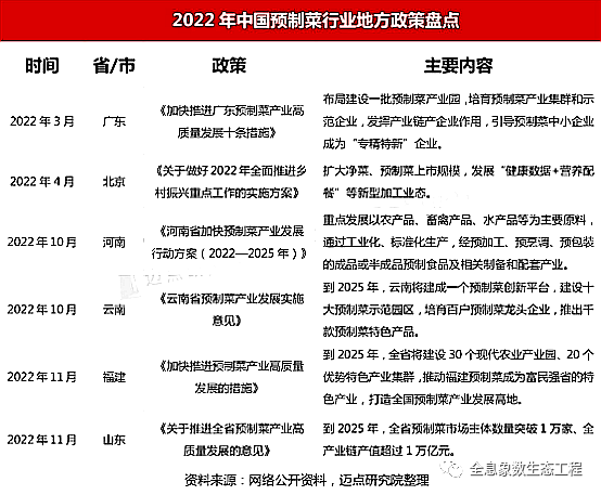 隨著預制菜產業的火爆,不少企業競相入局,國內多地出臺加碼扶持政策,助力中國預制菜產業加速發展。廣東出臺全國首個省級預制菜產業政策《加快推進廣東預制菜產業高質量發展十條措施》,積極部署預制菜產業發展。河南、云南、福建、山東和北京等省市也陸續推出預制菜產業發展政策,發揮產業基礎優勢,建設預制菜創新平臺,建設預制菜產業園,壯大預制菜產業集群,發揮產業鏈企業作用,培育示范企業等等一系列措施,支持當地預制菜產業發展。