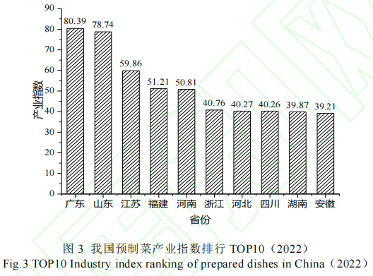據企查查數據顯示,截止 2022 年 12 月底,我國現有預制菜企業 6.4 萬家,其中近 5 年成立的企業占比 58%。全國預制菜企業分布前 10 名的省份中,農業大省山東以 0.77 萬家位居榜首,河南和江蘇分別以 0.59 萬家和 0.55 萬家位居二、三位。山東的預制菜企業有 7 家企業在 A 股上市,數量同樣位居全國榜首,其總市值高達 300 億元。全國預制菜企業分布前 10 名的城市中(圖 2),深圳以1945 家位居榜首,長春以 1732 家緊隨其后。餐寶典發布的《2022 中國預制菜產業指數省份排行榜》,廣東繼續處于領頭羊的地位,山東緊隨其后,分值分別為 80.39 和 78.74,遠高于其他省份(圖 3)。