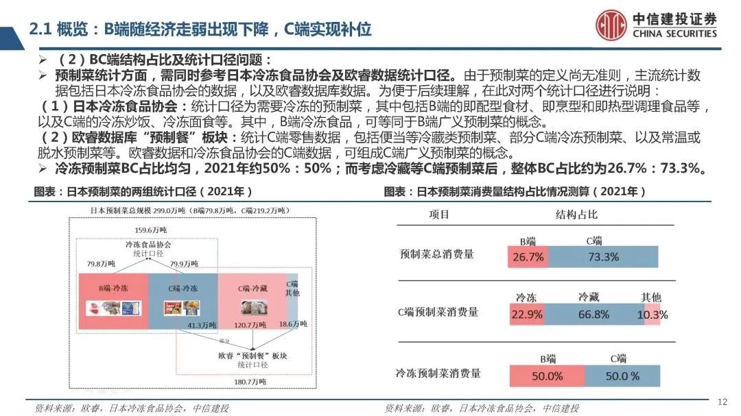 (2)BC端結構占比及統計口徑問題:預制菜統計方面,需同時參考日本冷凍食品協會及歐睿數據統計口徑。由于預制菜的定義尚無準則,主流統計數 據包括日本冷凍食品協會的數據,以及歐睿數據庫數據。