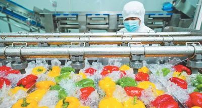 北京一家食品公司的工人正在清洗彩椒。