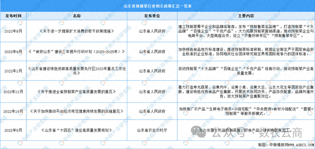 為搶占預制菜新風口,山東省高度重視預制菜產業發展,省第十二次黨代會報告明確提出“支持預制菜產業發展”。為打造一批預制菜產業高地和產業集群,山東省出臺《關于推進全省預制菜產業高質量發展的意見》《“食安山東”建設三年提升行動計劃(2023-2025年)》《關于進一步提振擴大消費的若干政策措施》等政策。政策指出,山東將著力打造壽光蔬菜、沿黃肉牛、沿黃小麥、沿黃大豆、山東大花生等國家級產業集群,建設特色優勢食品產業集群,開展技術協同攻關、產品協作配套、品牌共建共有,放大預制菜產業集聚效應。具體政策如下: