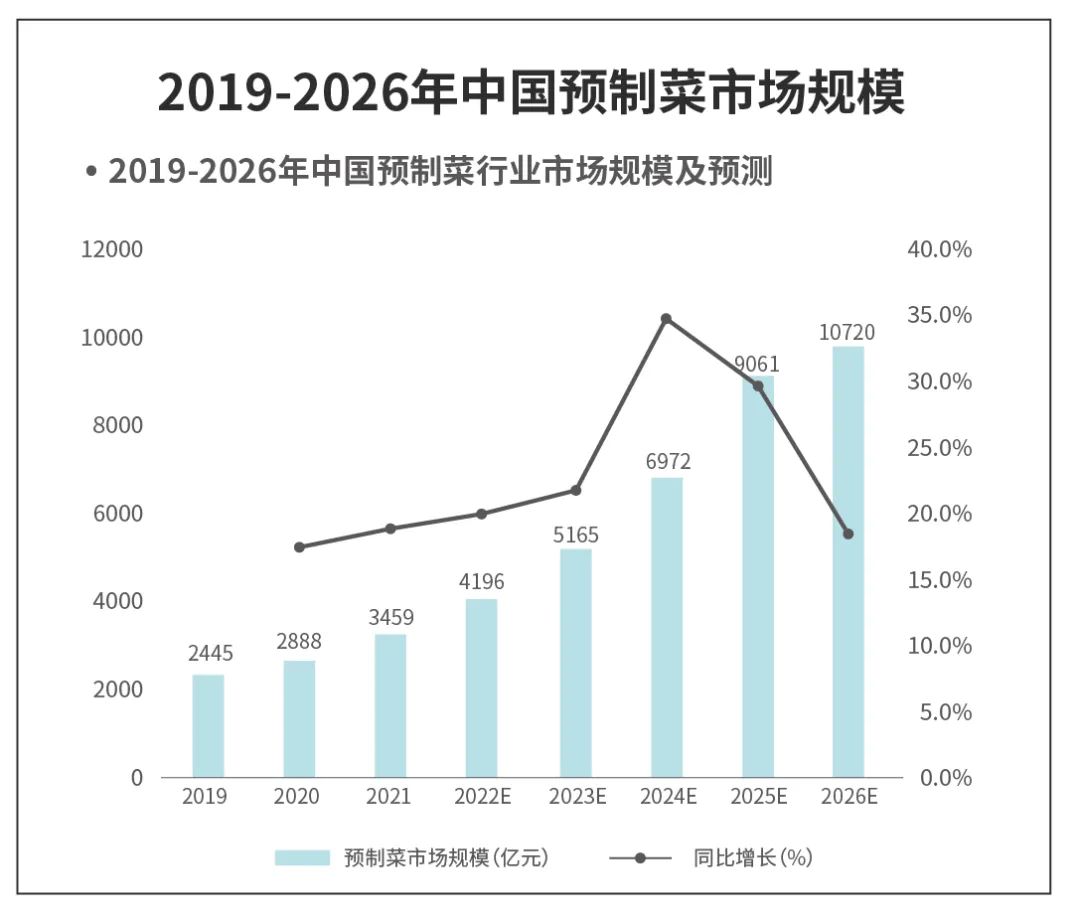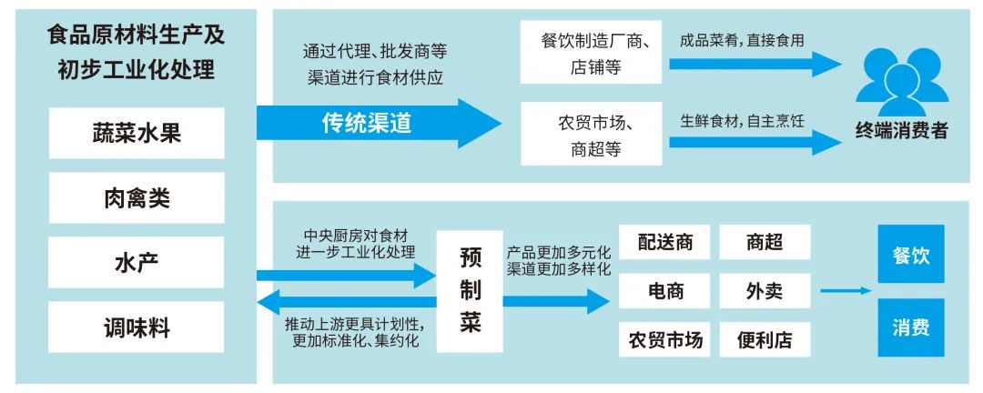 但在標準化的食品生產中,人的因素被盡可能地抹去,生意的可規模性、可集中度和需求穩定性更高。隨著技術和需求的升級,餐飲和食品相向而行,預制菜應運而生。作為餐飲和食品融合發展的產物,預制菜在保證口味條件下,最大程度提高工業化和擴張性,在某種程度上實現效率最優。