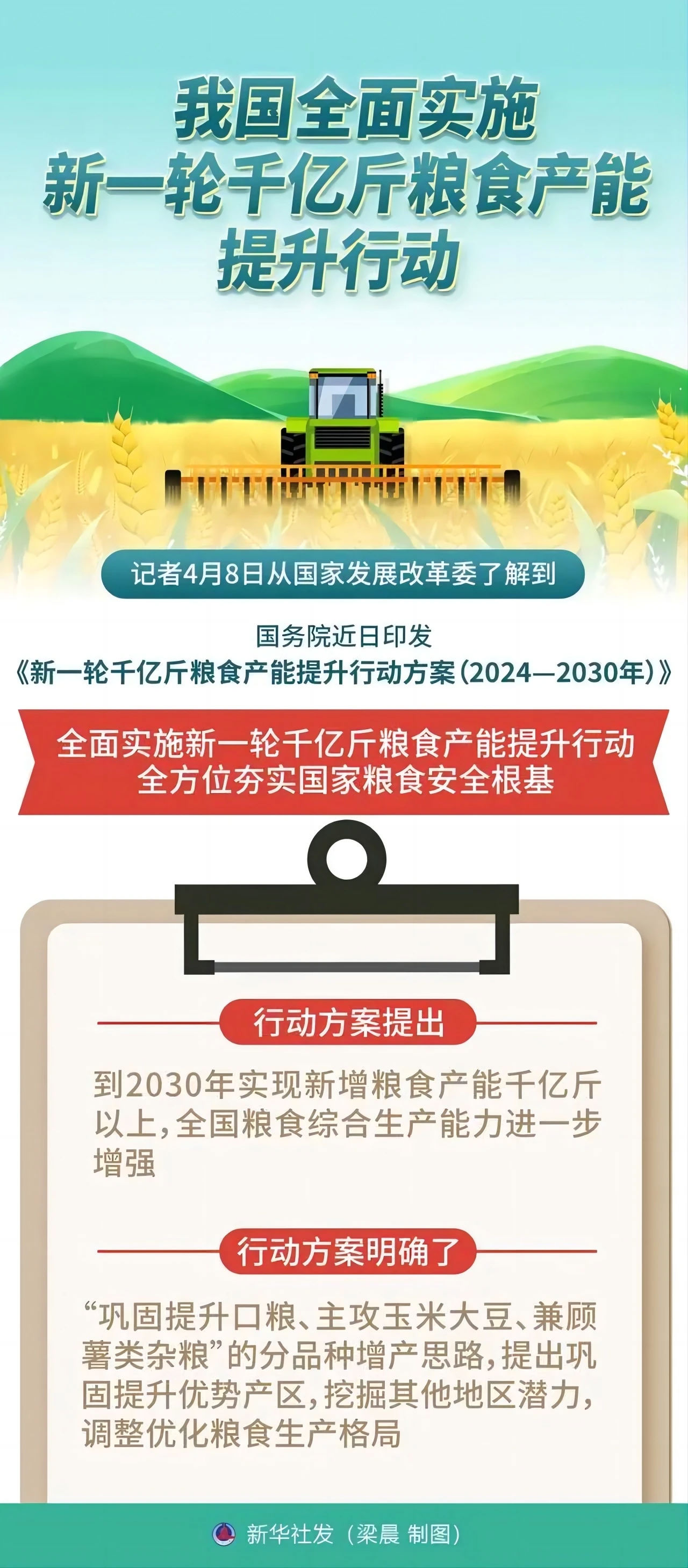 為進一步提升糧食產能,有效保障國家糧食安全,國家發展改革委、農業農村部牽頭會同有關部門編制了《新一輪千億斤糧食產能提升行動方案(2024—2030年)》,近日由國務院印發實施。