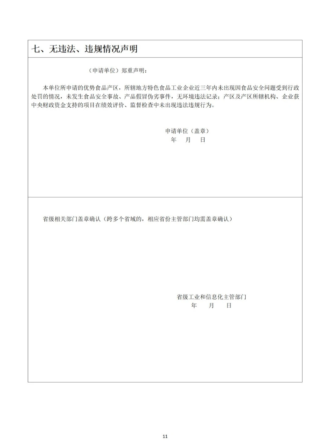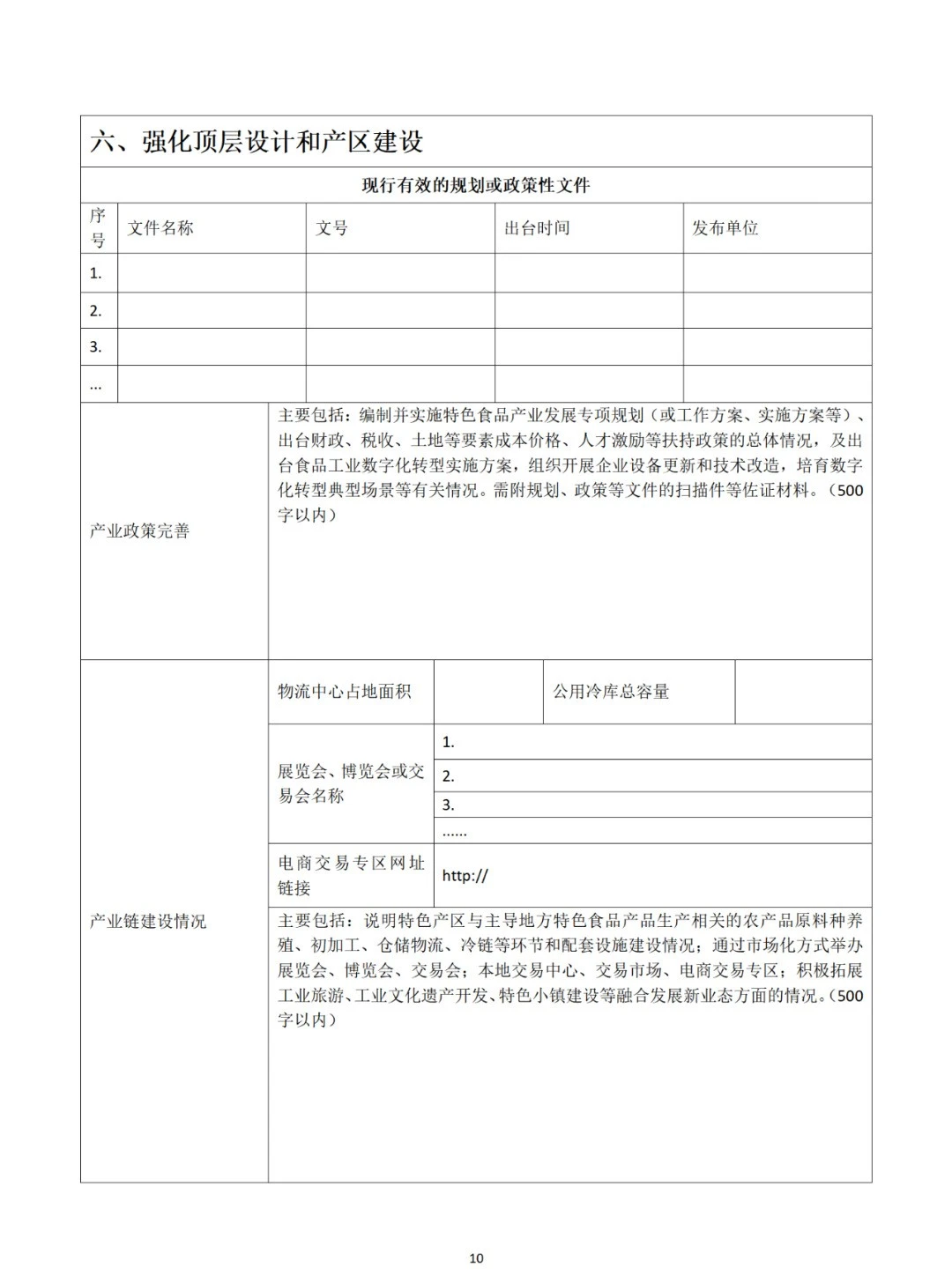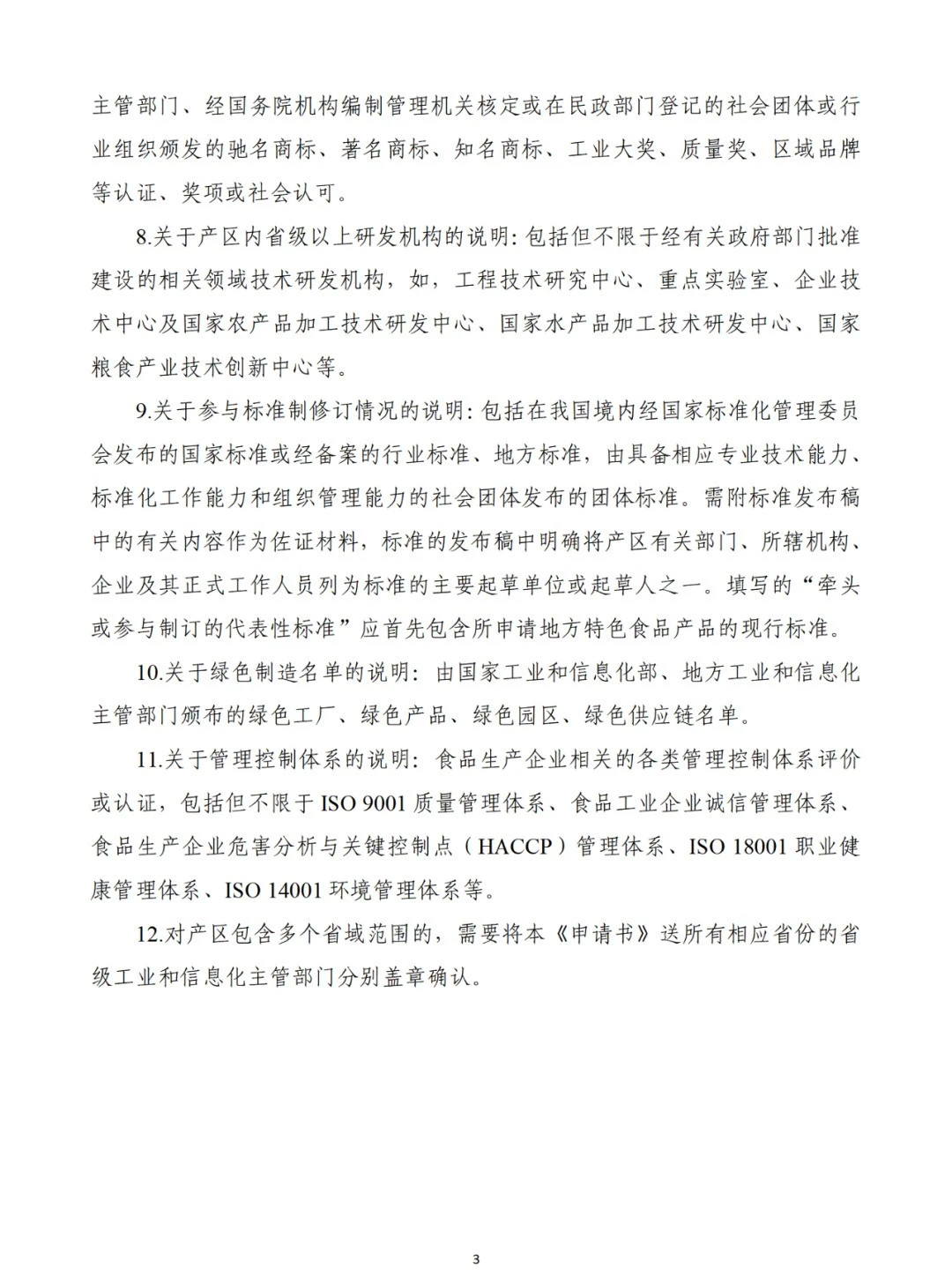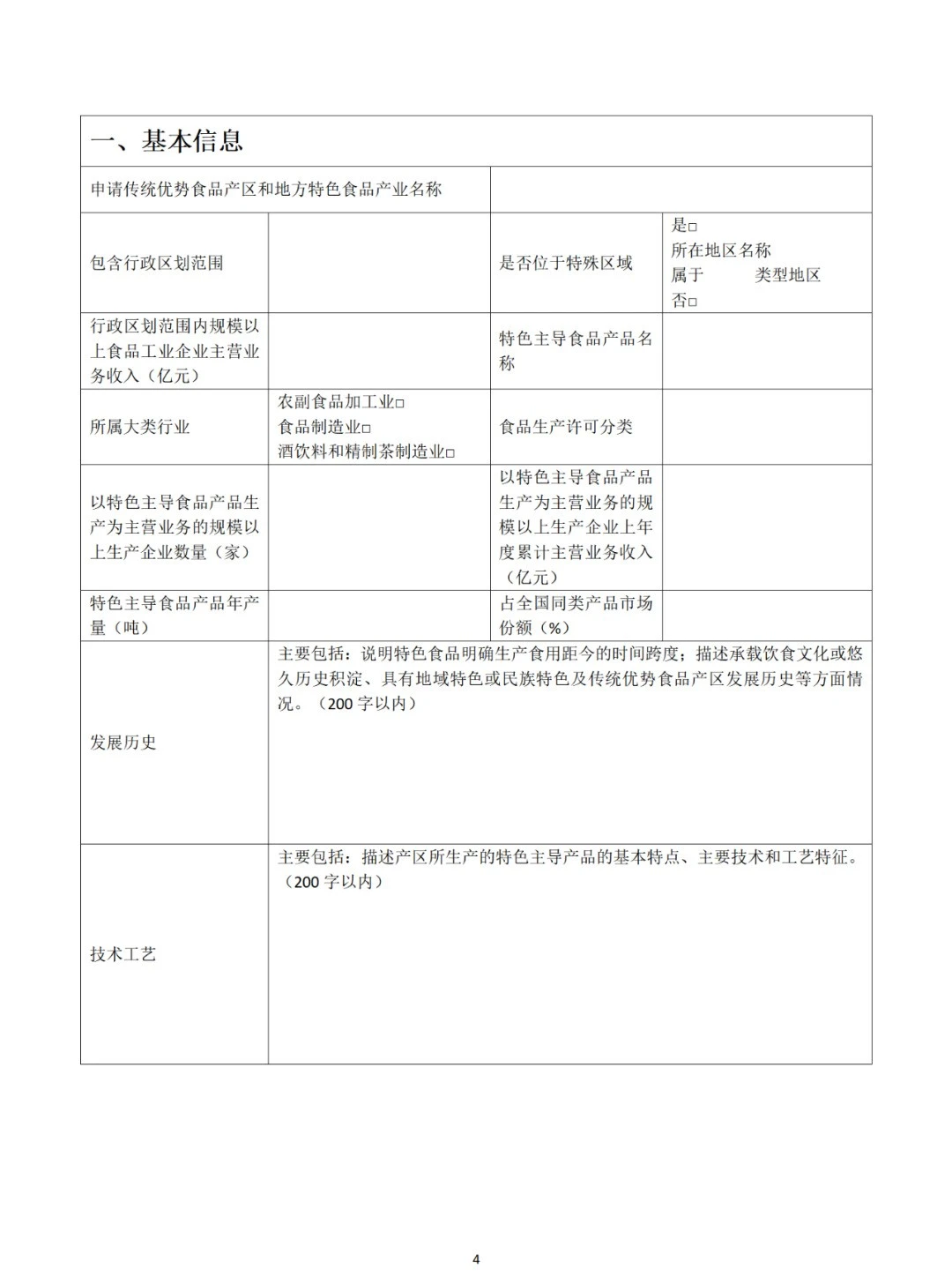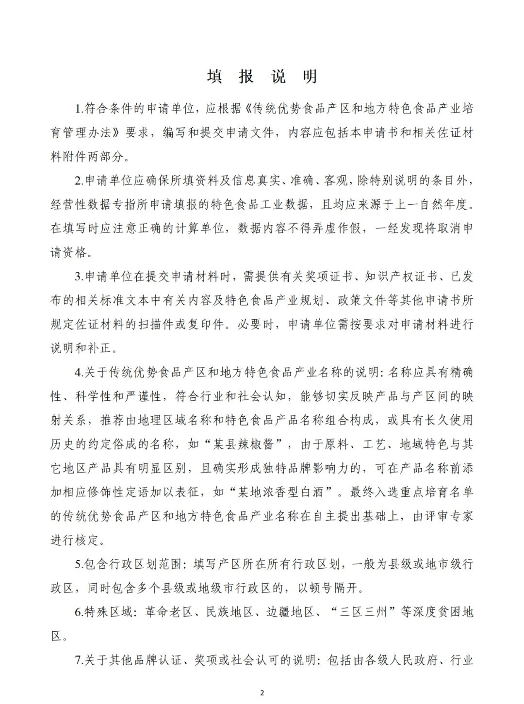 (二)提出申請。申請工作每年開展1次。申請主體填寫《傳統優勢食品產區和地方特色食品產業重點培育名單申請書》(附件1),編制《傳統優勢食品產區和地方特色食品產業培育工作方案》(模板見附件2),并附相關佐證材料,報當地省級工業和信息化主管部門。