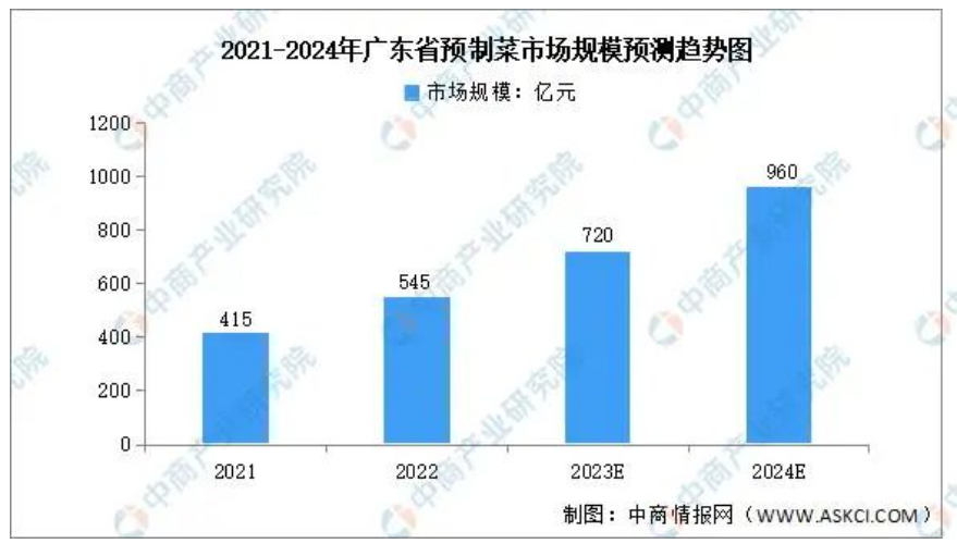 預制菜作為一種方便快捷的消費產品,近年來取得快速發展,廣東更是農業大省、消費大省,水產品等多項農產品產量居全國前列。2022年,廣東省預制菜市場規模為545億元,同比增長31.3%,占全國的13%,遠超全國平均水平,預制菜企業超過6000家,發展勢頭強勁。中商產業研究院分析師預測,2024年廣東省預制菜市場規模將增至960億元。