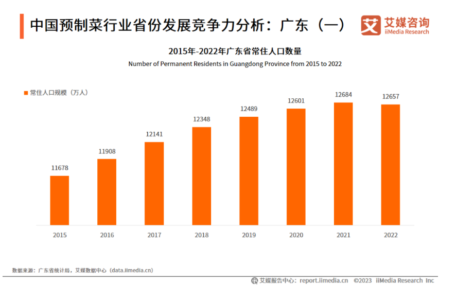 數(shù)據(jù)顯示,2015-2022年,廣東省常住人口數(shù)不斷上升,從2015年的11678萬(wàn)人上升至2022年的12657萬(wàn)人。經(jīng)濟(jì)的發(fā)達(dá)、落戶政策的優(yōu)化等都吸引了大量人才入戶廣東,促進(jìn)廣東省常住人口的持續(xù)增長(zhǎng)。廣東省人口量大,日常消耗食品量大,具備較強(qiáng)的預(yù)制菜產(chǎn)品消費(fèi)潛力。