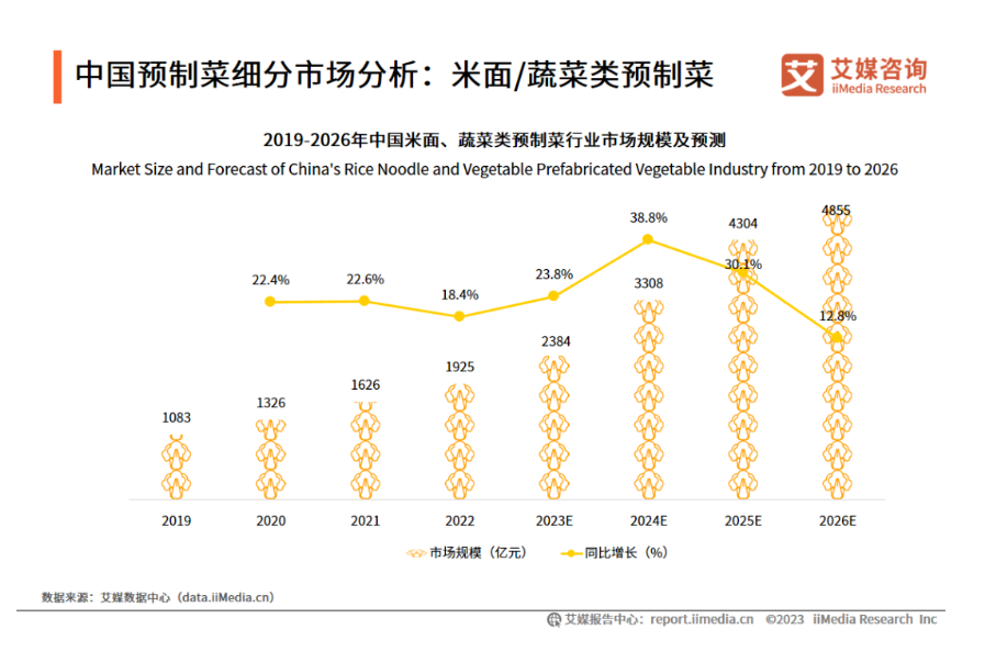 iiMedia Research(艾媒咨詢)數(shù)據(jù)顯示,2022年中國(guó)米面、蔬菜類預(yù)制菜行業(yè)市場(chǎng)規(guī)模為1925億元,同比增長(zhǎng)18.4%,預(yù)計(jì)2026年中國(guó)米面、蔬菜類預(yù)制菜行業(yè)市場(chǎng)規(guī)模將達(dá)4855億元。米面、蔬菜構(gòu)成人們基本飲食結(jié)構(gòu),米面、蔬菜類預(yù)制菜行業(yè)將持續(xù)擴(kuò)大市場(chǎng)規(guī)模以滿足消費(fèi)者需要。