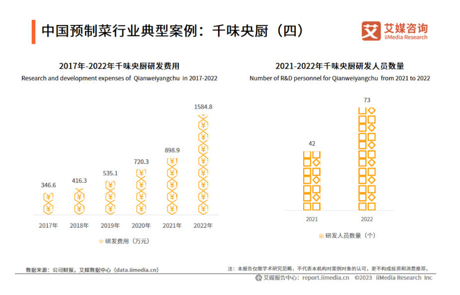 數(shù)據(jù)顯示,2017年-2022年,千味央廚研發(fā)費(fèi)用投入逐年增多。其中,2022年的研發(fā)費(fèi)用為1584.8萬(wàn)元,同比增長(zhǎng) 76.29%。與此同時(shí),2022 年千味央廚研發(fā)人員達(dá)到73 人,同比增加了 73.81%。近年來各大預(yù)制菜企業(yè)愈發(fā)重視產(chǎn)品研發(fā),試圖搶占預(yù)制菜賽道先機(jī),占據(jù)市場(chǎng)份額。