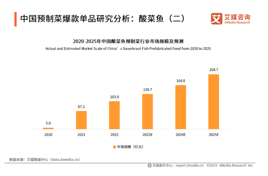 酸菜魚預(yù)制菜市場(chǎng)火熱,多品牌入局推廣,通過直播電商推動(dòng)酸菜魚預(yù)制菜C端市場(chǎng)快速發(fā)展。酸菜魚成為預(yù)制菜行業(yè)典型爆款產(chǎn)品。iiMedia Research(艾媒咨詢)數(shù)據(jù)顯示,中國(guó)酸菜魚預(yù)制菜市場(chǎng)在2022年迎來高速增長(zhǎng),市場(chǎng)規(guī)模突破100億元,預(yù)計(jì)2025年將達(dá)到204.7億元。