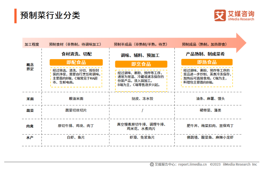 預(yù)制菜行業(yè)可按照加工程度以及原輔料來劃分,可以分成即配食品、即烹食品以及即熱食品。即配食品為經(jīng)過清洗、切配加工,但未經(jīng)過調(diào)味腌制的蔬菜、肉禽等產(chǎn)品。即烹食品為經(jīng)過調(diào)味、裹粉、預(yù)炸等工序的半成品。即熱食品為經(jīng)過調(diào)味、腌制的菜品進(jìn)一步炒制、蒸煮后的熟制品,再以速凍的方式保存。