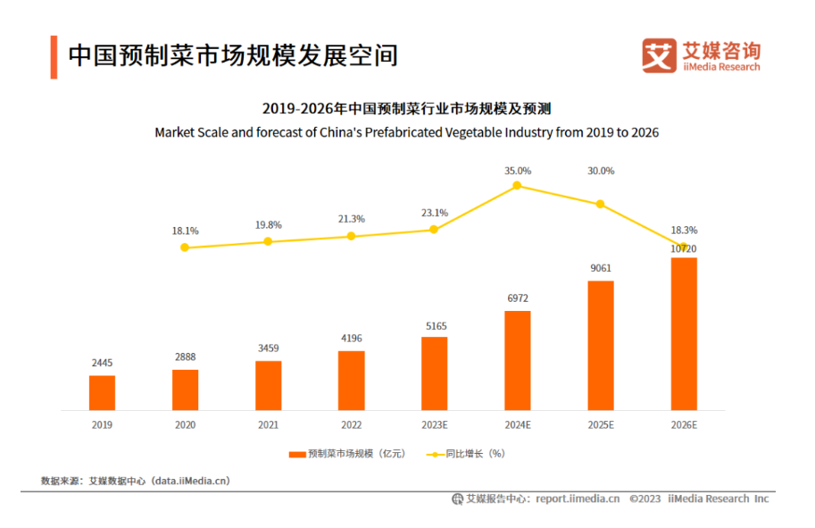 iiMedia Research(艾媒咨詢)數(shù)據(jù)顯示,2022年中國(guó)預(yù)制菜市場(chǎng)規(guī)模為4196億元,同比增長(zhǎng)21.3%,預(yù)計(jì)未來中國(guó)預(yù)制菜市場(chǎng)保持較高的增長(zhǎng)速度,2026年預(yù)制菜市場(chǎng)規(guī)模將達(dá)10720億元。預(yù)制菜有效地降低了餐廳運(yùn)營(yíng)成本,順應(yīng)了當(dāng)下消費(fèi)者便捷、營(yíng)養(yǎng)的飲食需求,吸引各大連鎖餐飲品牌入行布局。