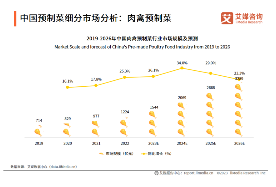 iiMedia Research(艾媒咨詢)數(shù)據(jù)顯示,2022年中國(guó)肉禽預(yù)制菜行業(yè)規(guī)模為1224億元,同比增長(zhǎng)25.3%,預(yù)計(jì)未來中國(guó)肉禽預(yù)制菜市場(chǎng)規(guī)模將持續(xù)擴(kuò)大,2026年肉禽預(yù)制菜市場(chǎng)規(guī)模將達(dá)3289億元。隨著人們生活條件改善,肉制品市場(chǎng)的需求量將持續(xù)上升,且上漲速度加快。