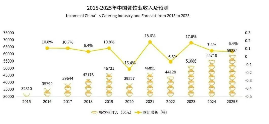 數據顯示,中國餐飲行業規模呈現不斷擴大的趨勢,2024年中國餐飲行業市場規模為55718億元,同比增長7.4%。這一增長主要受到提振消費政策、“中華美食薈”“餐飲+賽事”“夜經濟”“展演+美食”等活動的推動,消費者外出就餐的熱情高漲,進一步拉動了餐飲市場的需求。目前,餐飲行業在短期內將平穩增長,預計2025年市場規模將達59284億元。