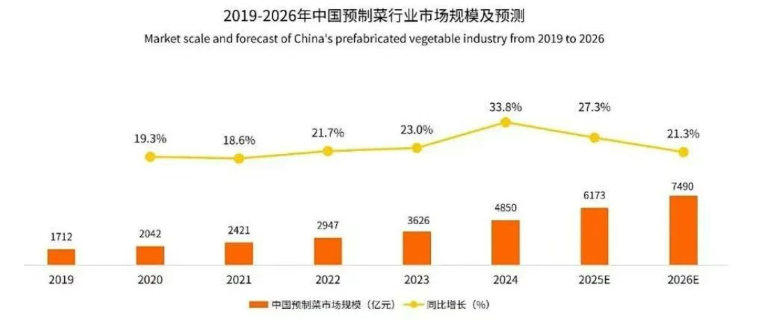 2024年中國預制菜市場規模已經達到4850億元,同比增長33.8%,整體呈現上升趨勢。隨著中國預制菜市場科學技術的發展和扶持政策的落實,到2026年預制菜市場規模有望達到7490億元。預制菜市場的崛起,也吸引了眾多連鎖餐飲品牌的目光,這些品牌紛紛入行布局,將預制菜納入自己的產品線中,以此滿足消費者對便捷、營養飲食的追求。隨著市場競爭的加劇,預制菜企業在傳統菜式中不斷尋求突破,推出更多符合消費者口味和營養需求的新型預制菜產品,進一步推動了預制菜市場的繁榮發展。