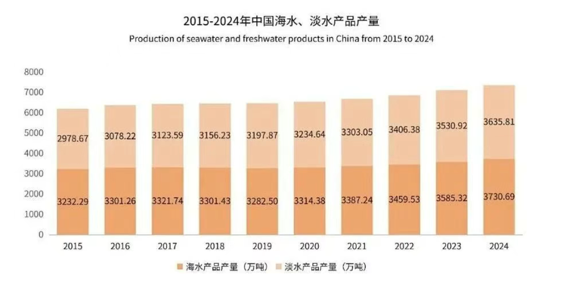 數據顯示,2024年中國海水產品產量為3730.69萬噸,淡水產品產量為3635.81萬噸,年產量基本保持在3000萬噸以上。中國海水產品產量高于淡水產品產量,兩者之間的差值正在逐年減少,得益于漁業生產的規模化、集約化和標準化,漁業產品的質量、數量和安全性得以提升,有效保障了市場的穩定供應,漁業市場的產品銷售價格也能夠保持平穩。
