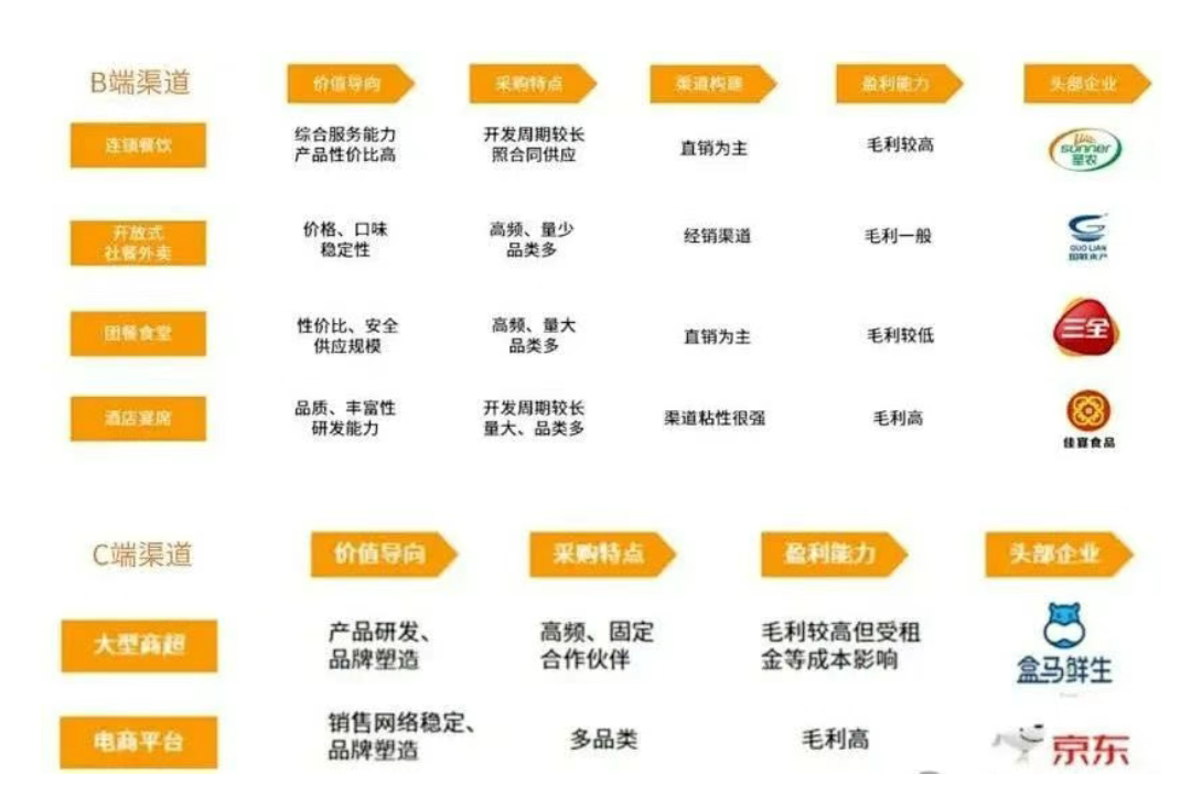 C端渠道指的是以零售平臺為主要銷售渠道,如大型商超和各類電商平臺。在疫情特殊時期,預制菜這一面向C端市場的產品異軍突起,成為食品行業的新寵。預制菜新品牌如雨后春筍般涌現,帶有節慶性質的年菜產品更是受到了廣大消費者的熱烈關注。這一現象反映了人們在疫情期間對生活便利性的追求,也揭示了食品行業在創新和變革中的新趨勢。在餐飲市場中,產品力和渠道力成為關鍵的成功因素。產品研發需要不斷創新,以滿足消費者日益多樣化的需求;品牌塑造則需要注重形象建設和口碑傳播,提升消費者對產品的信任度和好感度;銷售網絡的布局則需要考慮渠道的覆蓋范圍和物流的便捷性,確保產品能夠及時送達消費者手中。