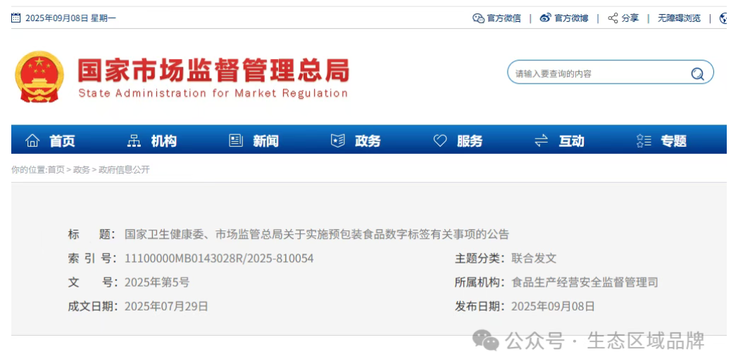 國家衛(wèi)生健康委、市場監(jiān)管總局關(guān)于實施預(yù)包裝食品數(shù)字標(biāo)簽有關(guān)事項的公告